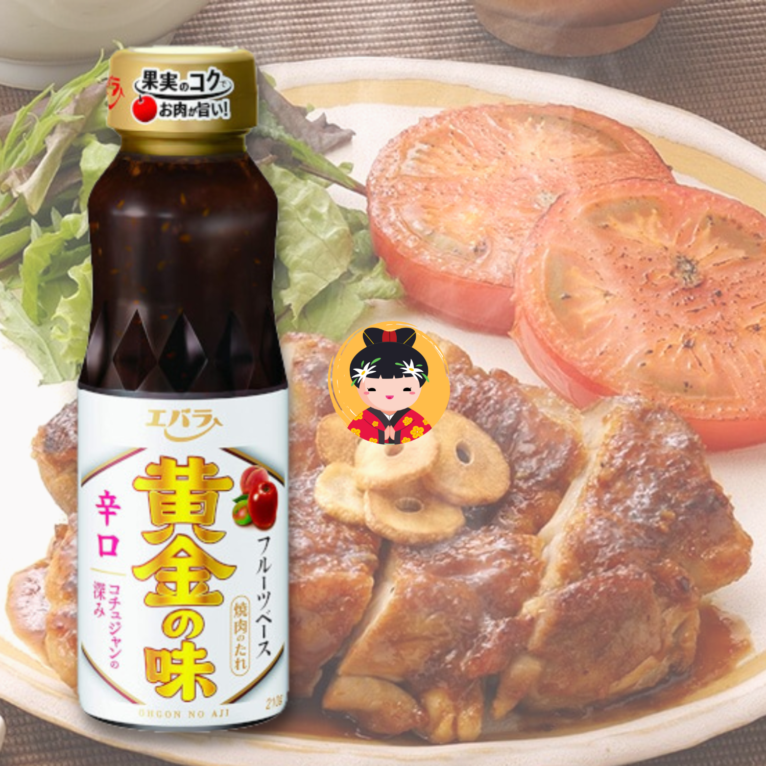 Ingredients:Fruit puree [apple (produced in Japan), peach, plum], SOY SAUCE, Sugar, Amino acid liquid, Gochujang, Bean sauce, Reduced starch syrup, Garlic, Honey, Salt, WHITE SESAME, Onion extract, Protein hydrolyzate, SESAME OIL, Spice/caramel pigment *partially including WHEAT, SESAME, SOYBEAN< /b>, Peaches and Apples