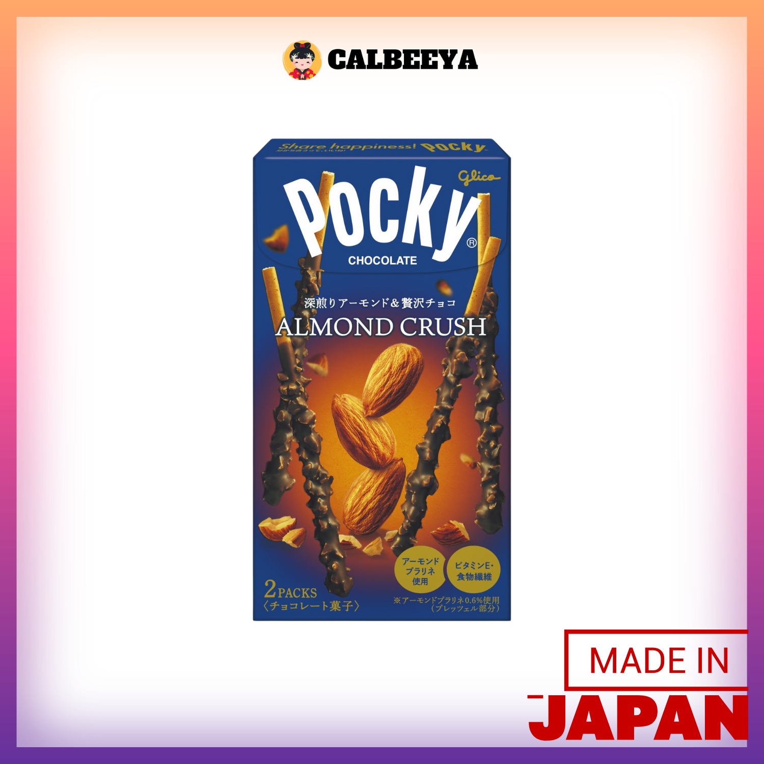 Deep roasted coarsely ground almonds are wrapped in chocolate and combined with a fragrant whole wheat pretzel made with almond praline. This Pocky is packed with the luxurious taste of almonds and milk chocolate, as well as vitamin E and dietary fiber. *0.6% almond praline used (pretzel part)