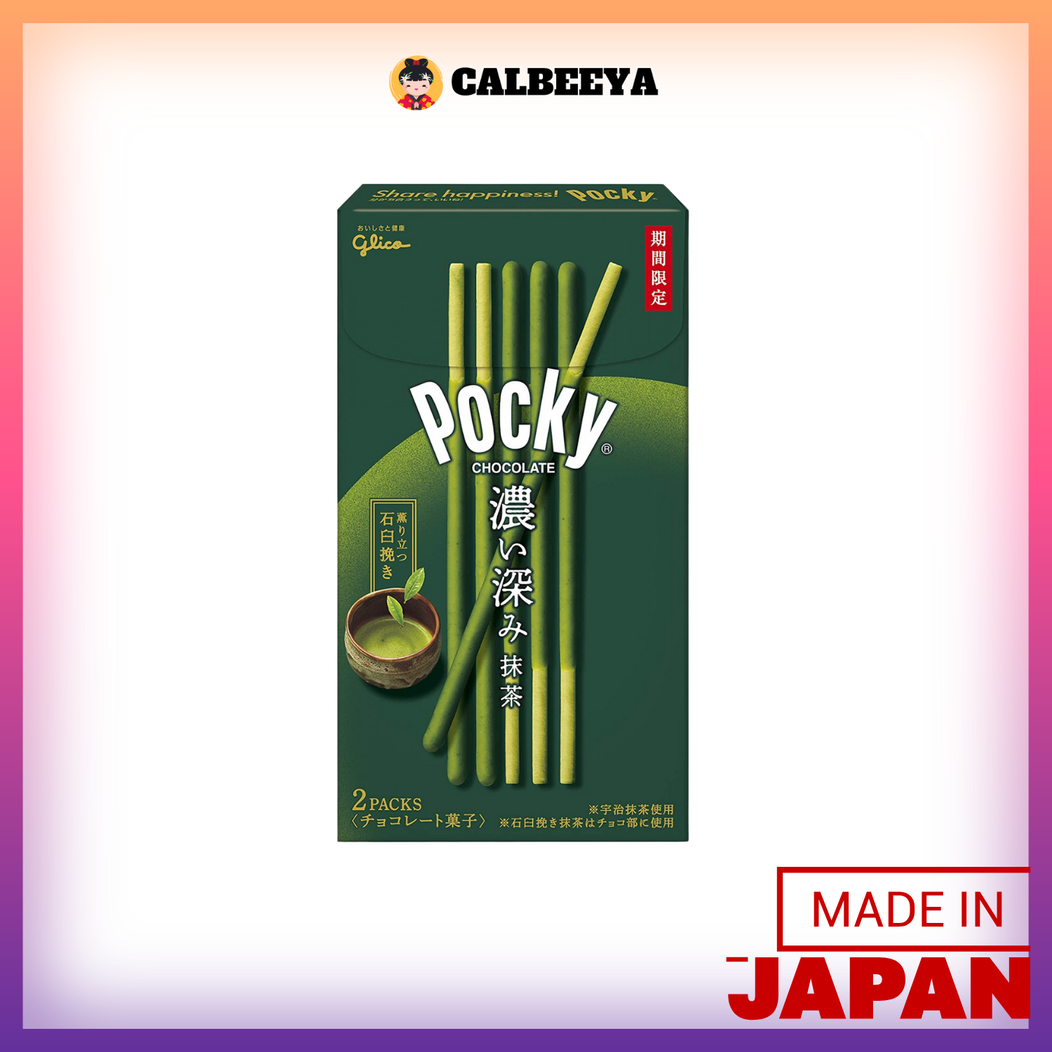 巧克力部分采用石磨抹茶制成,香气浓郁、风味十足;烘焙饼干部分则使用微苦的抹茶,整支百奇充满了抹茶的香气与层次感。巧克力和脆饼部分均使用“宇治抹茶”,带来高品质的抹茶享受。