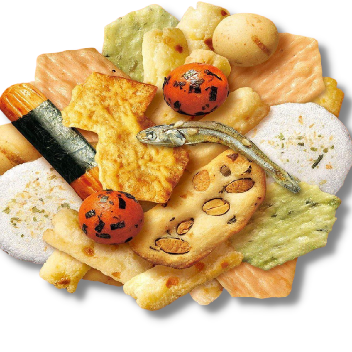 Vegetable fats and oils (domestic and Chinese production), starch, rice flour (non-glutinous rice, glutinous rice), non-glutinous rice, wheat flour, corn flour, sugar, chocolate coating, squid sheets (squid, fish paste, starch syrup, others), soybeans, peanuts, edamame beans, processed black soybeans, salt, soy sauce, shrimp, corn grits, winter plum powder, starch syrup, honey, seafood extract seasoning, dietary fiber, cheese powder, dextrin, glucose fructose liquid sugar, seaweed, chicken extract seasoning Seasoning, squid, yeast extract powder, spices, green laver, vegetable protein, powdered egg white, powdered soy sauce, mirin, garlic oil, protein hydrolysate/modified starch, seasoning (amino acids, etc.), trehalose, shell calcium, emulsifier, coloring (carotenoid, red yeast rice, caramel, turmeric), leavening agent, calcium carbonate, flavoring, spice extract, (contains shrimp, wheat, egg, dairy products, peanuts, squid, sesame, soybeans, chicken, pork, gelatin)
