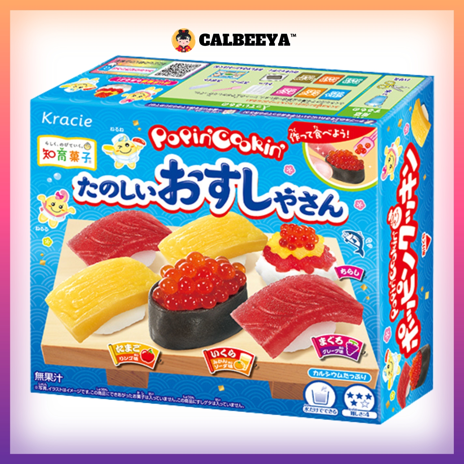 ingredient:Sugar (Made in Japan), glucose, lactose, starch, corn syrup, vegetable oil, dextrin, milk protein, fermented milk/modified starch, acidulant, calcium carbonate, flavoring, gelling agent (sodium alginate), coloring (squid ink pigment, vegetable pigment, gardenia, caramel, spirulina blue, safflower yellow), calcium sulfate, sodium caseinate, sodium pyrophosphate, calcium phosphate, emulsifier, sweetener (aspartame, L-phenylalanine compound, acesulfame K), (contains milk, squid, and soy).