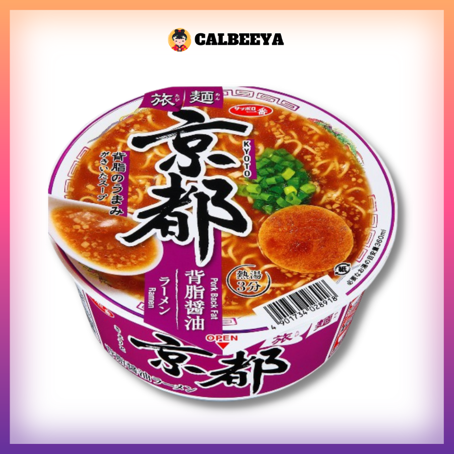 Sapporo Ichiban Tabi-Men Kyoto Seabura Shoyu Ramen Cup is a shoyu ramen with the flavour of back fat. This local cup ramen allows you to easily enjoy the taste of Kyoto's back fat shoyu ramen. The noodles have a smooth surface and a sticky texture. The noodles are also very flexible and well-dispersed in the soup, so you will never get tired of eating them. This Kyoto-style back fat soy sauce ramen soup has a mild, deep flavour of soy sauce and the richness of back fat. The red chilli adds an accent to the flavour. Ingredients are a combination of chashu pork and spring onions.