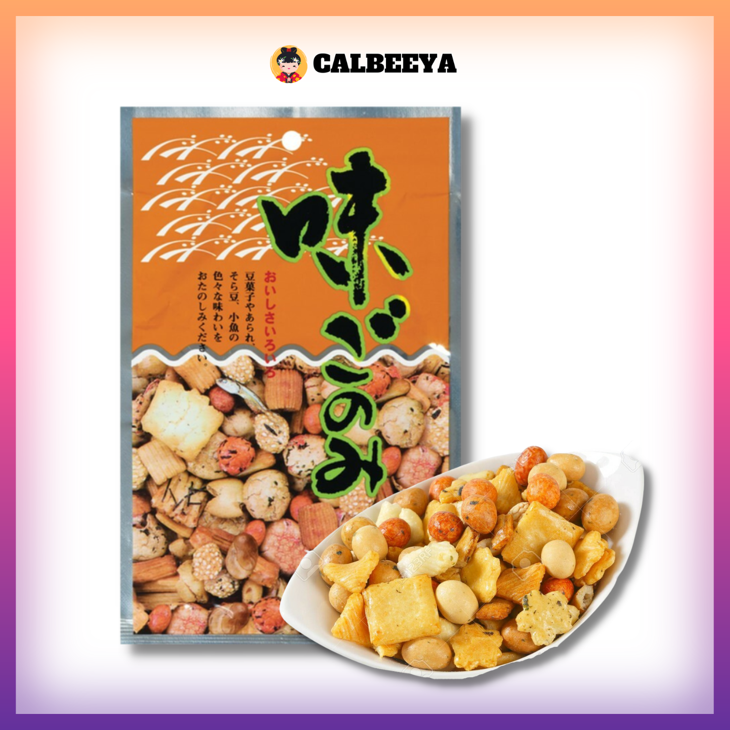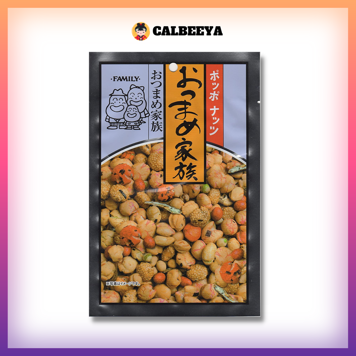 Ingredients:Peanuts, wheat flour, winter plum powder, green peas, Japanese anchovies, sugar, waxy cornstarch, shrimp powder, soy sauce, starch hydrolysate, vegetable oil, salt, cut squid, sesame seeds, seaweed, chili pepper, pepper, maltose, starch syrup, seasoning (amino acids, etc.), processed starch, coloring (red 3, yellow 4, yellow 5, blue 1, caramel color, annatto color), leavening agent, flavoring, (some ingredients contain soybeans and seafood)