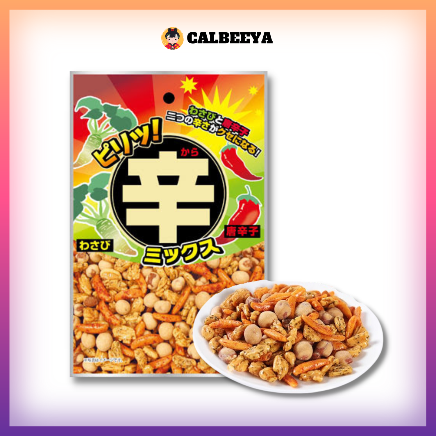 This product is a mix of salty bean snacks, super spicy persimmon seeds, and wasabi-flavored rice crackers. The spiciness of the wasabi and chili peppers is addictive!