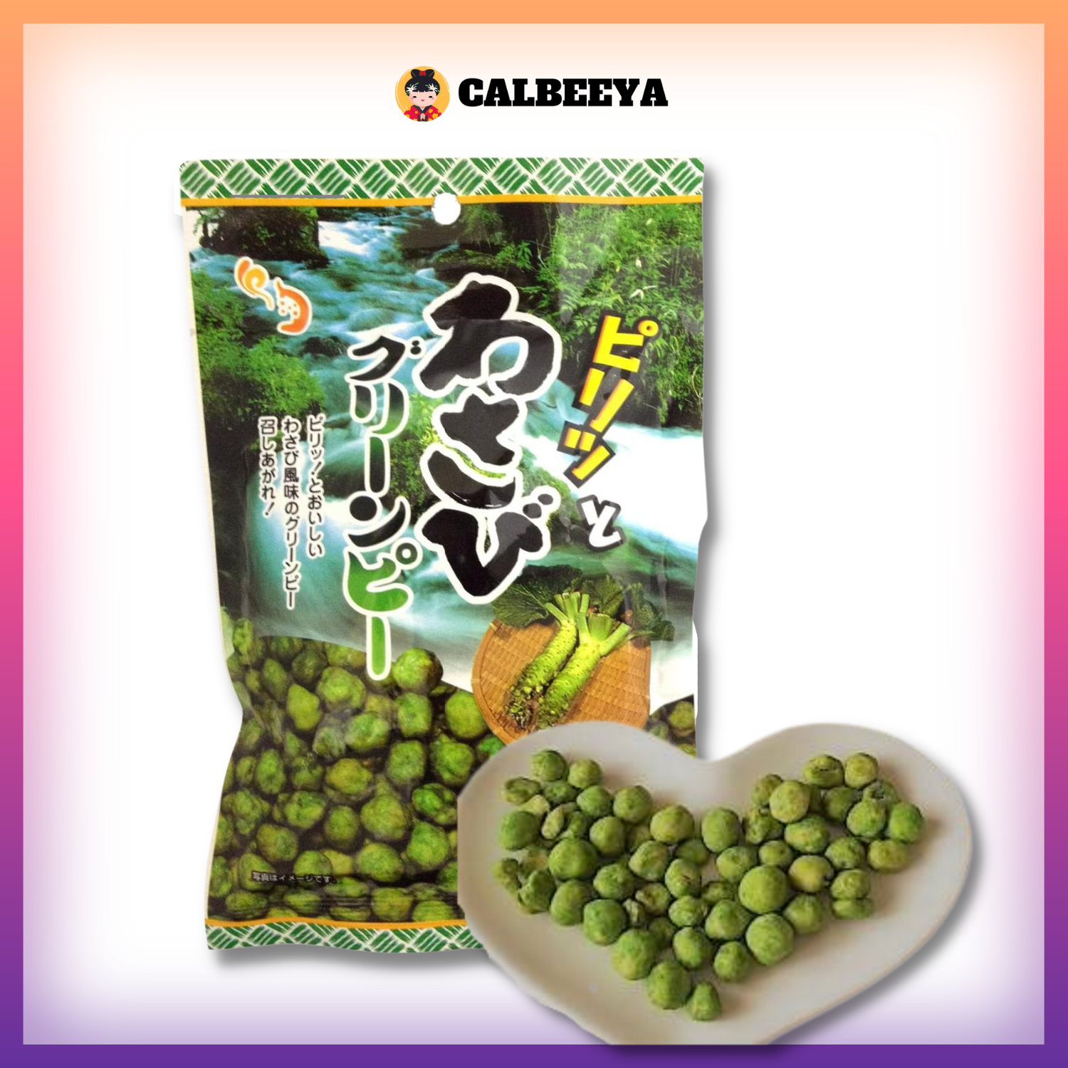 Ingredients: Green peas, wheat flour, waxy corn starch, kanbai powder (glutinous rice cracker powder), soy sauce, starch hydrolysate, wasabi powder, mustard powder, spices, sugar, salt, modified starch, seasoning (amino acids, etc.), food coloring (Blue No.1, Yellow No.4), leavening agents, flavoring.